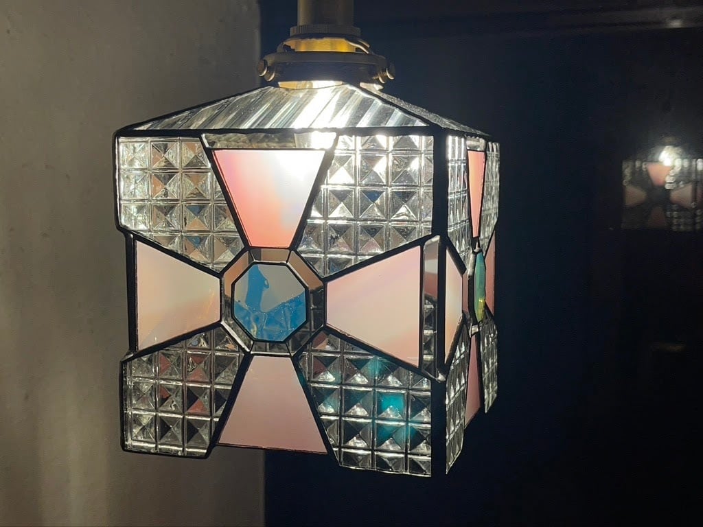 日本製の古い型ガラス(大正・昭和)を使った 懐かしい雰囲気のランプシェードを作りました。和空間にも洋空間にも合う小ぶりな吊り下げランプです。