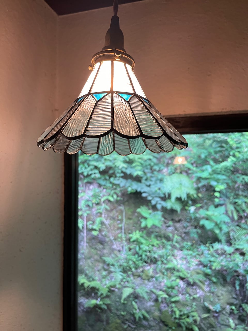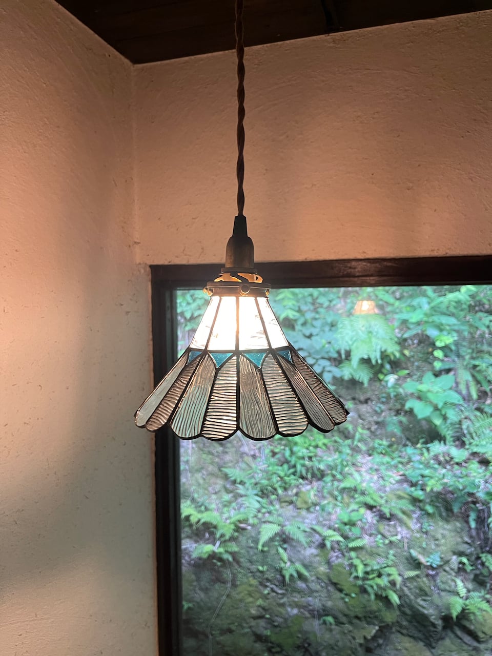 小さめでスタイリッシュなシェードです。クリア系のガラスを組み合わせて広がりのあるデザインにしました。ブルーのガラスをアクセントに配しています。