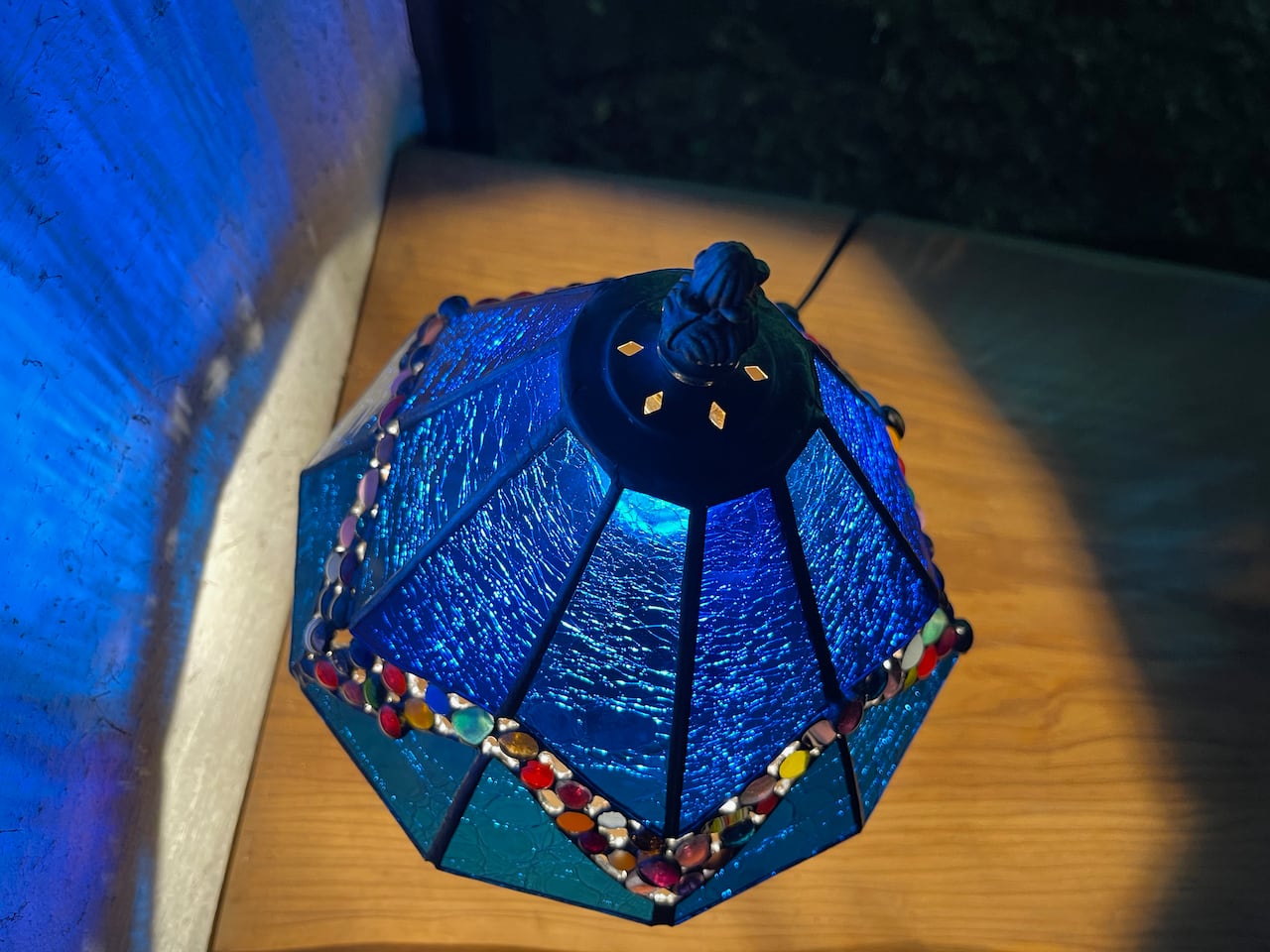 ランバーツ社製(独)のハンドメイドガラスを使用しています。微細な貫入模様(ヒビ割れ)が光を浴びて美しく輝きます。間にガラスパーツを散りばめて華やかな要素を挟み込んでいます。壁に映るガラスの色と模様を永くお楽しみください。