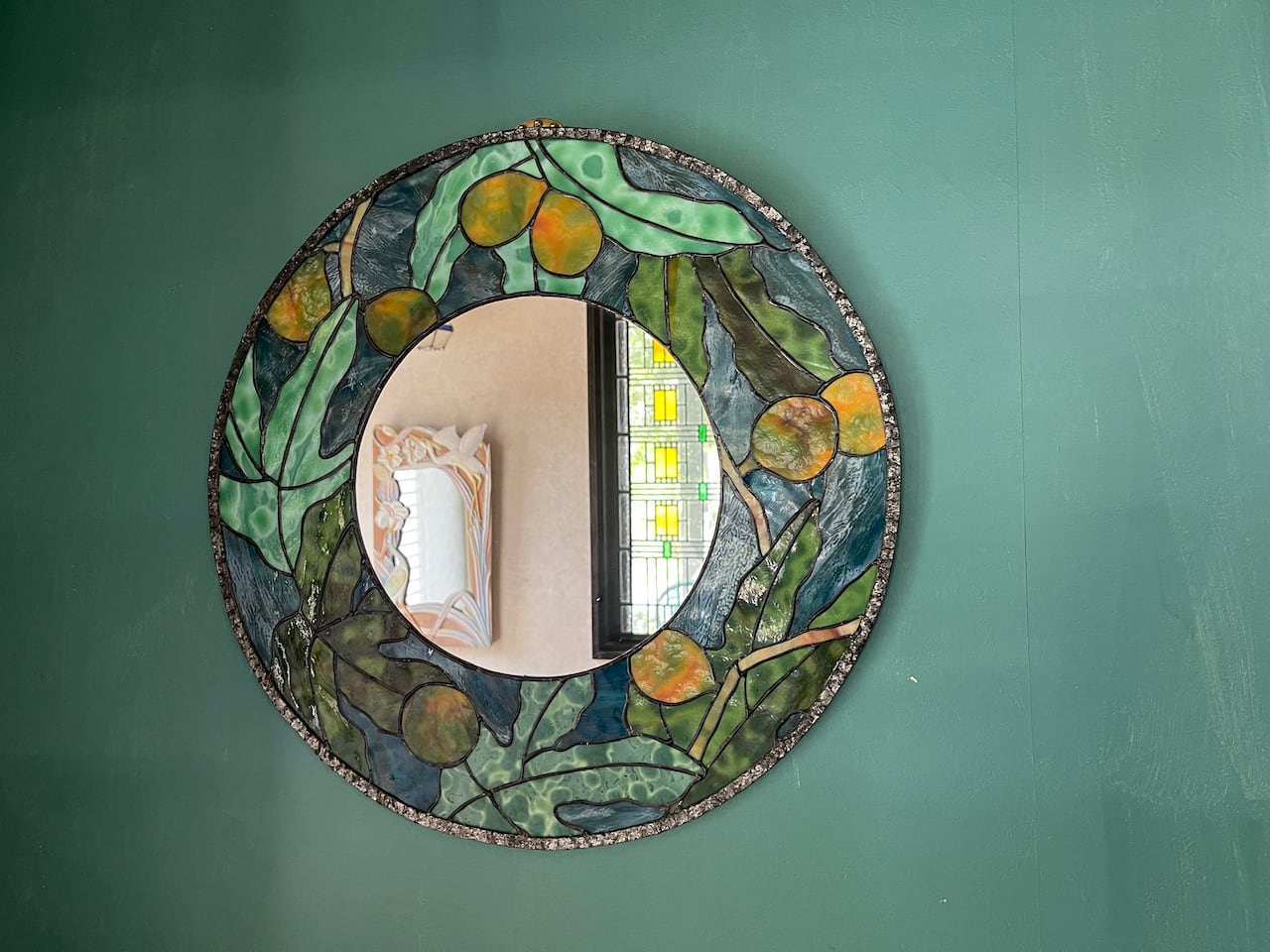 雑貨 > 壁掛ミラー > 壁掛ミラー デザイン・柄 > 花・植物 価格帯 >30,000円〜49,999円 ---------- 大きめのミラーを作りました。 ウィリアム モリスのデザインのようなシックな色彩で無花果の模様を描きました。 リビングや寝室、洗面所の壁に豪華でミラー面も直径27cmあります。 新築祝い、結婚のお祝いなど喜んでいただける贈り物に。 サイズ/直径460mm 付属品/壁掛けフック