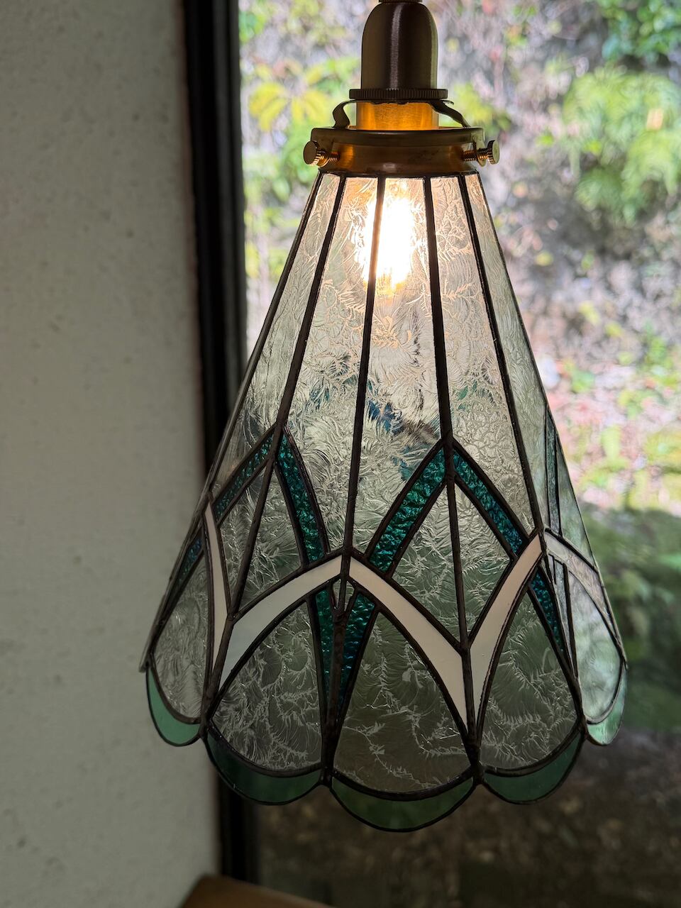 編んだり束ねたりの糸が日本のオールドガラスでレースのような繊細な模様(グルーチップ)の上でダンスをしているようです。爽やかなグリーン系の差し色を施してみました。エレガントな消灯時にも美しいランプです。