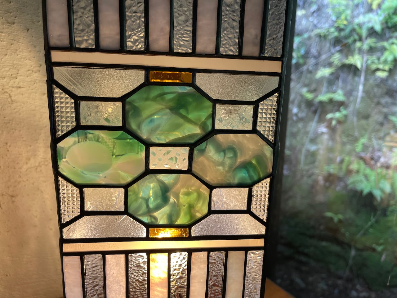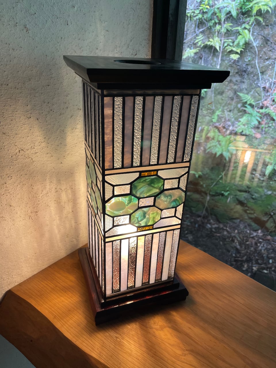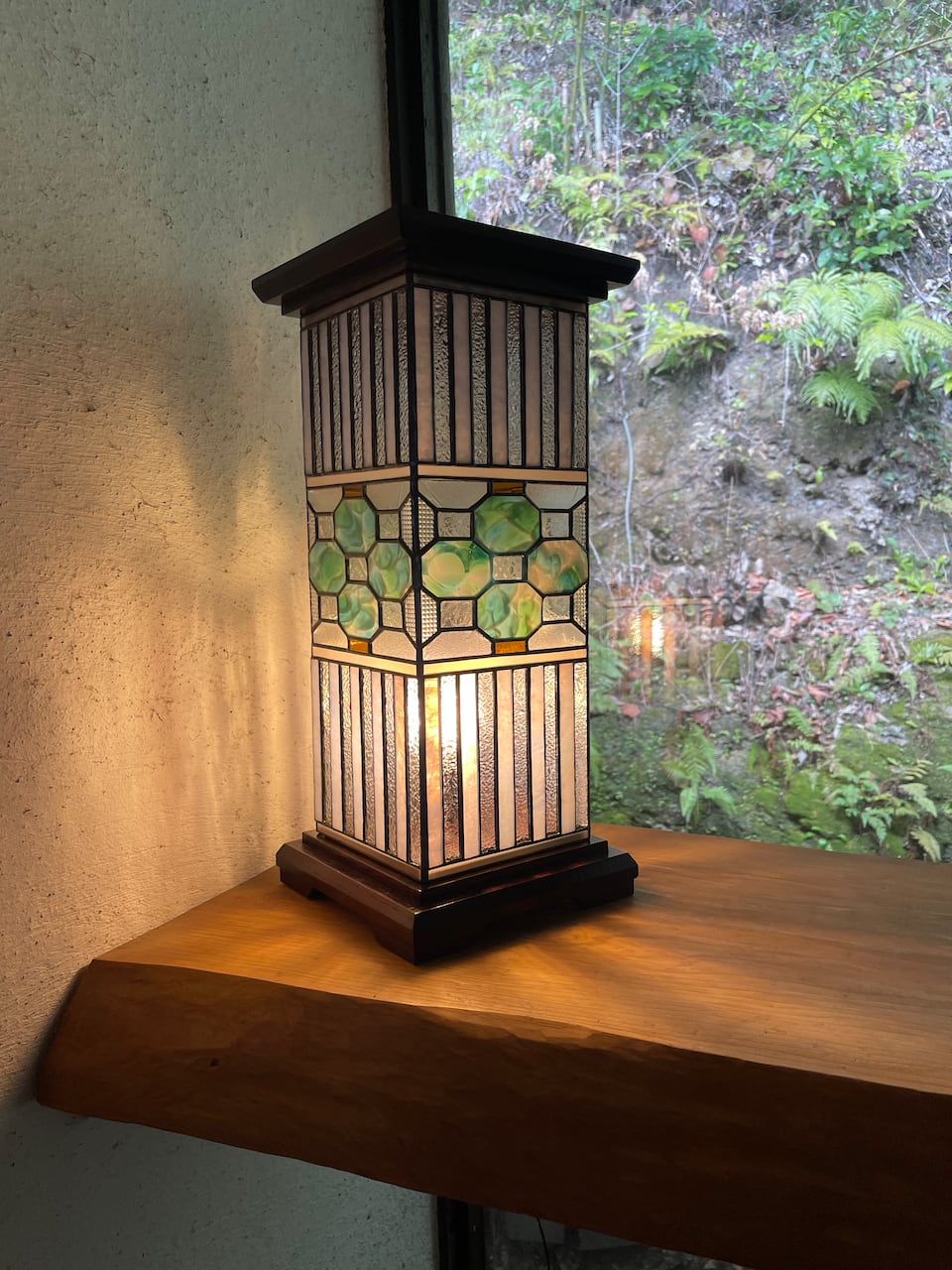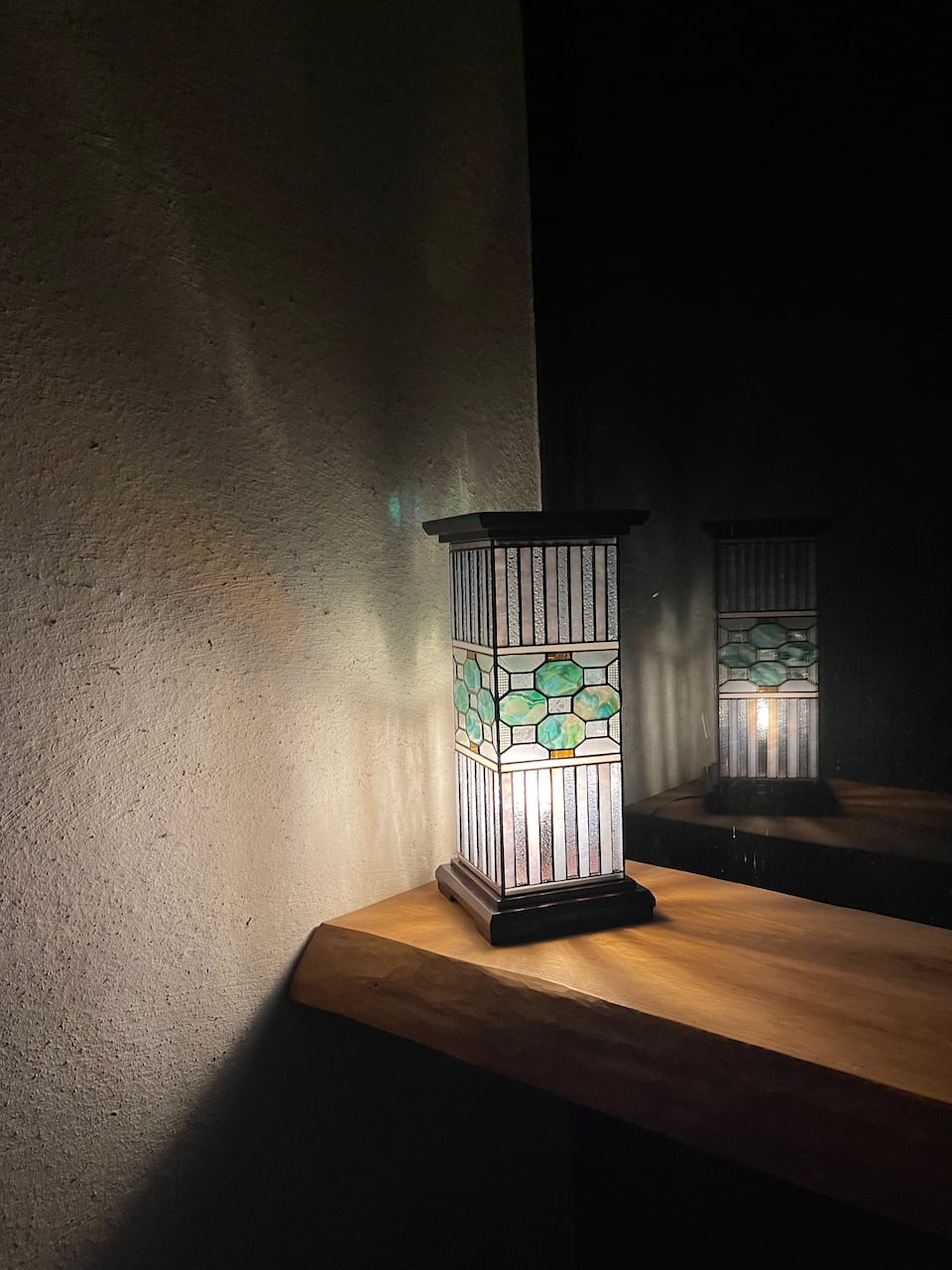 日本の昭和期のオールドガラスは種類もたくさんありましたが、今となっては希少で貴重な素材になりました。このランプは小紋やモダンなデザインの型板ガラスをふんだんに使っています。それに加えてフリモント社製の秀逸なハンドメイドグラスを中央に蜀江文様として配しています。