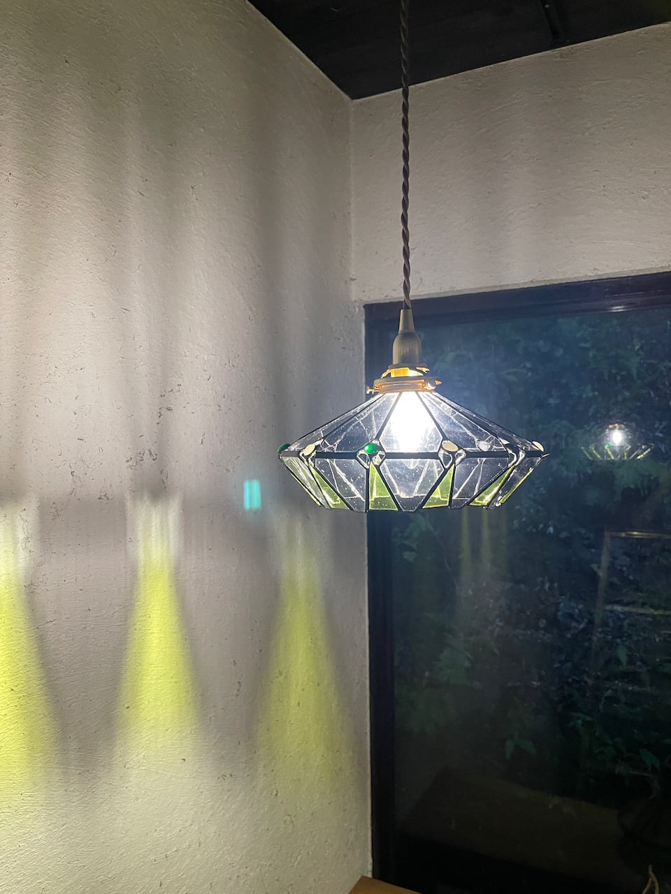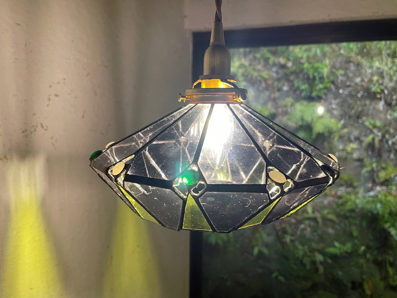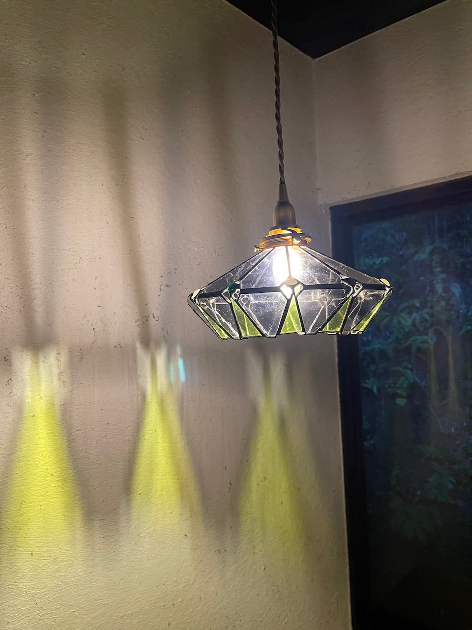 クリア感の強いアンテックガラスばかりを使用してスタイリッシュに仕上げたモダンな形のシンプルなランプです。壁への反映もグラフィカルでアートなランプになりました。
