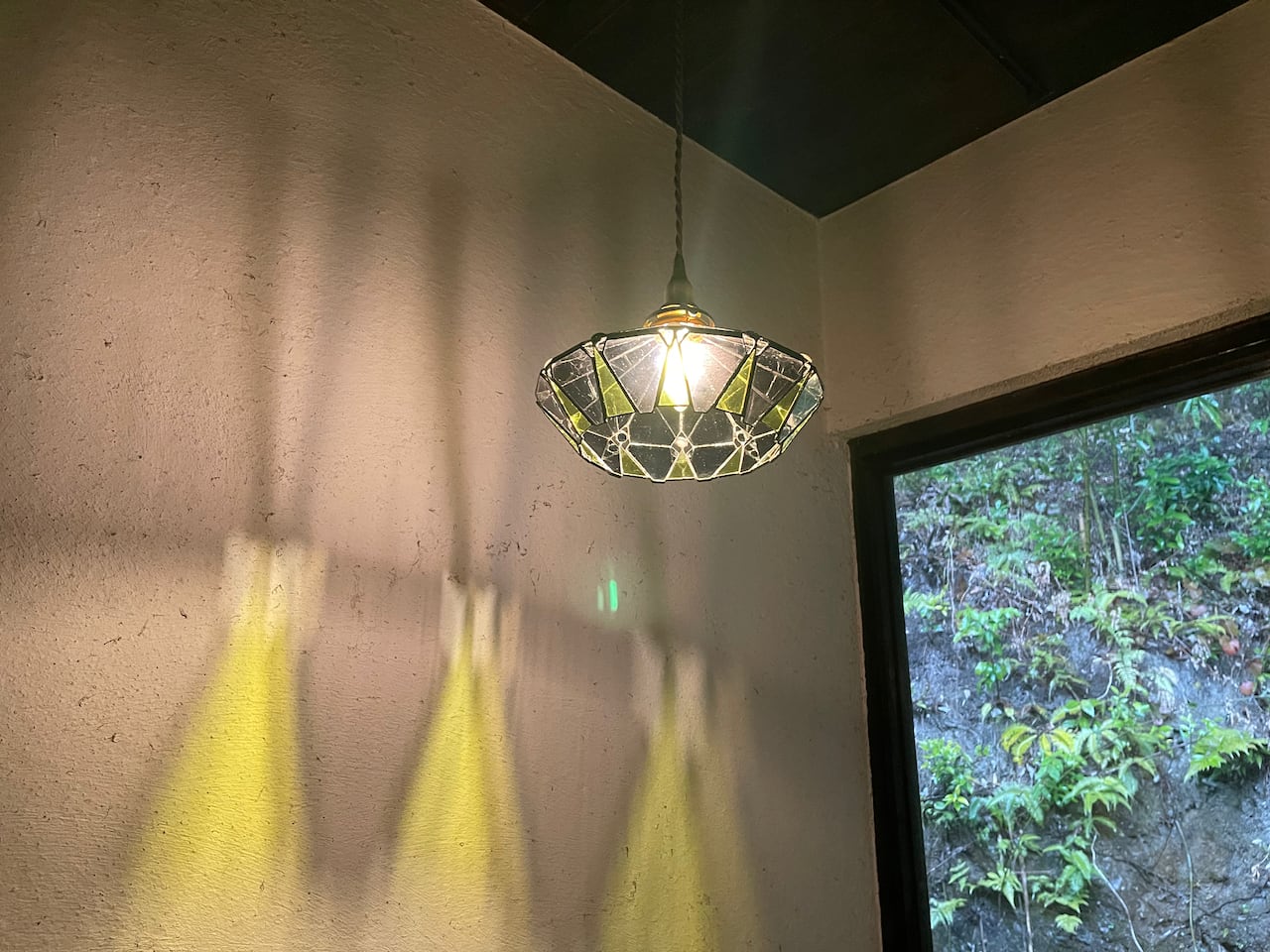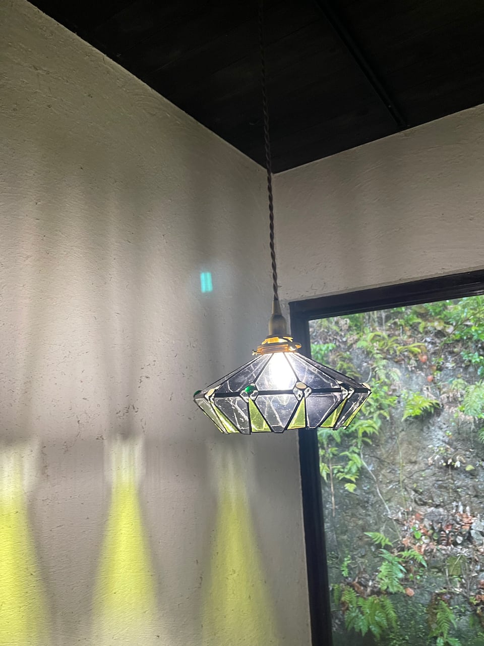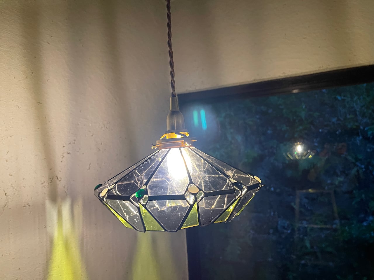 クリア感の強いアンテックガラスばかりを使用してスタイリッシュに仕上げたモダンな形のシンプルなランプです。壁への反映もグラフィカルでアートなランプになりました。